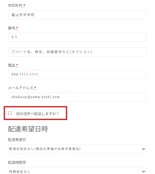 別住所への配送方法は、オンラインショップのお支払いまで進まれると請求先情報の詳細登録がありメールアドレス登録の下、配達希望時間の上に、「□ 別の住所へ配送しますか?」がございますのでチェックを入れていただくと配送先のご住所をご登録いただけます。請求先と配送先が同一の場合は不要です。